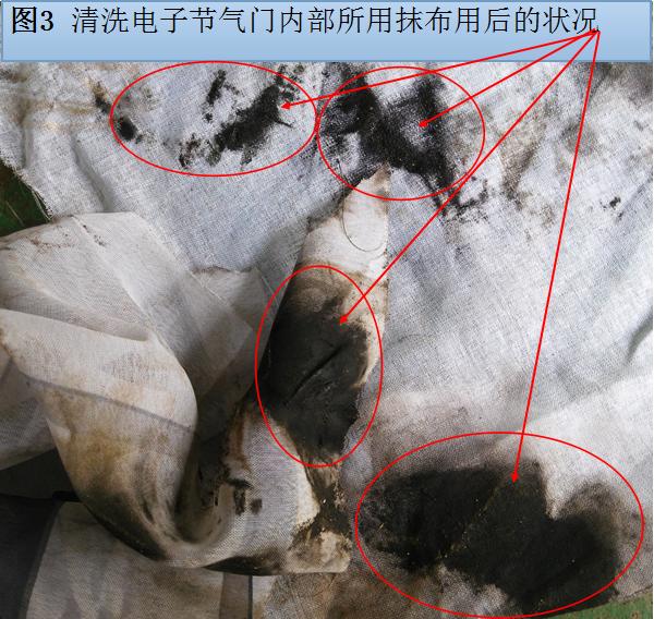 且空调不工作!试图加大油门,结果发动机死火!多次试机结果一样!后来慢慢摸索到了“门道”,怠速的时候,只要很小心的很慢很慢加油,转速即可上去且超过1000RPM后空调泵开始吸合,此时空调工作正常,内循环出风口在2档各出风口风温度约为6℃左右,空调压缩机工作几分钟后会停一会再工作一会,如此循环,表明空调系统工作正常。现在空调系统大修后有两个问题要处理,1是怠速转速太低,2是空调怠速时不工作。此2个问题实际为1个问题:怠速不稳,动力不足,发动机电脑为了保护动力系统,指示空调不工作。回想在空调维修的时候,电气系统基本没有动过,只是断开了电瓶的负极,把几个妨碍空调管路的灯光线路插头、空气流量计的插头拔过,以及仪表台有好几个插头拔过。维修空调3天时间里没有动过其他地方,难道……难道是发动机电脑由于断电时间太长复原了出厂数据?想到这里,拆开了节气门上的进气软管,发现节气门很脏,在钥匙打到ON状态下一人踩下油门踏板,另外一人把化清剂喷在干净的布上对节气门里进行清洁(注意不要用力碰节气门翻板),发现布很快变得十分的黑(图3),