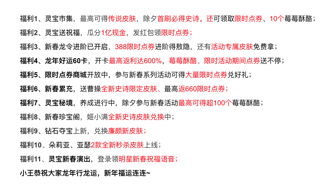 从2月7日开始至2月21日,玩家可以在活动中心参与【灵宝市集】活动。通过收集和出售小龙糕,换取小龙币来刷新奖池,奖励丰厚,包括传说皮肤、史诗皮肤、限时点券和荣耀积分等。2月9日除夕当天,首次刷新必得史诗皮肤,别忘了登录领取你的莓莓酥酪和皮肤卡!