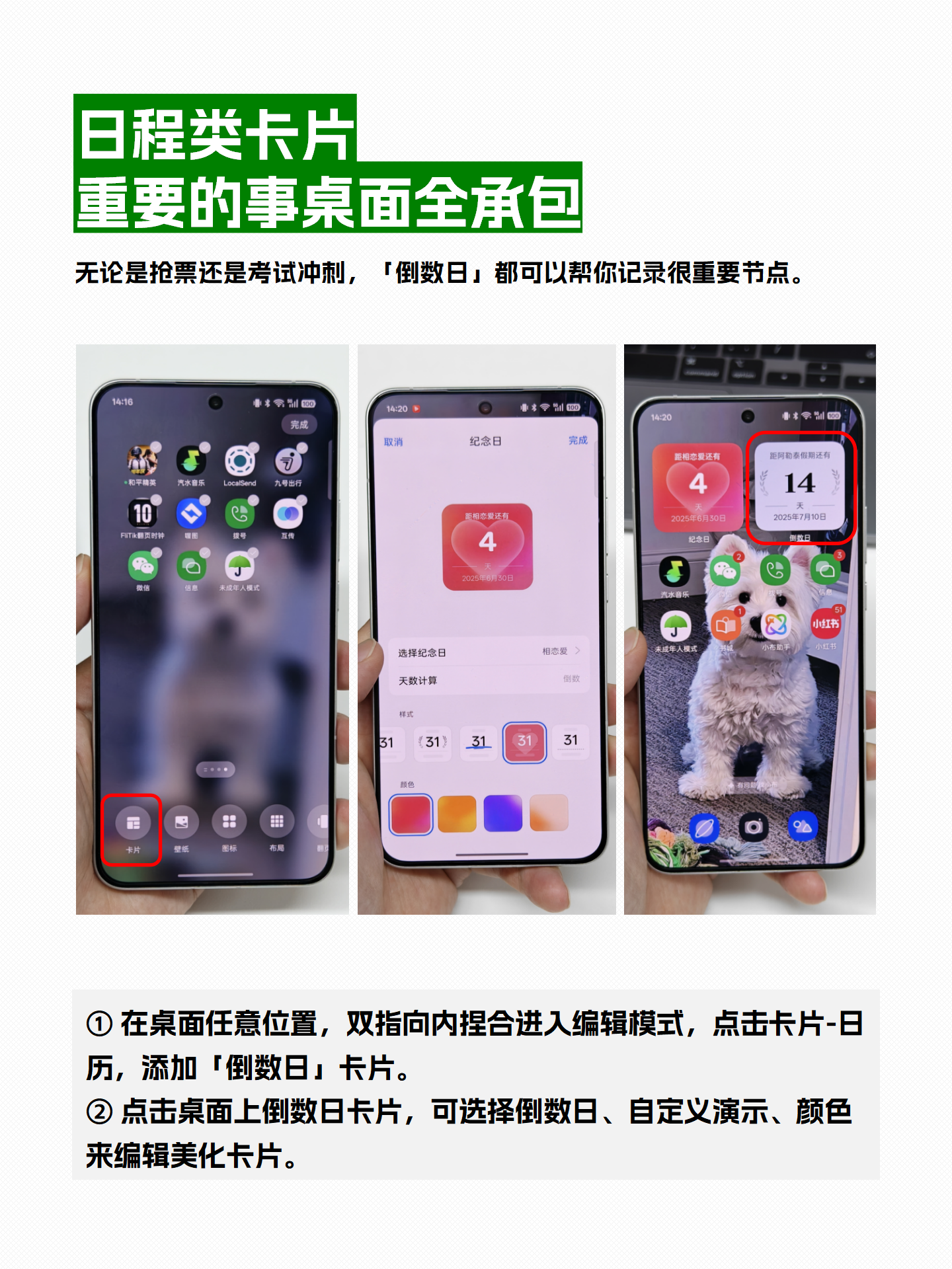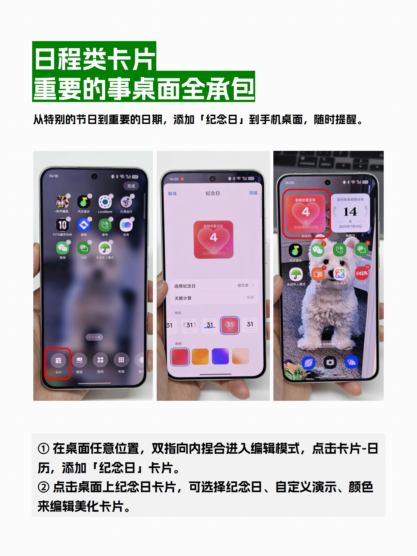 ✏️编辑方法:点击桌面上的纪念日卡片,可选择纪念日、自定义演示、颜色来编辑美化卡片。 -