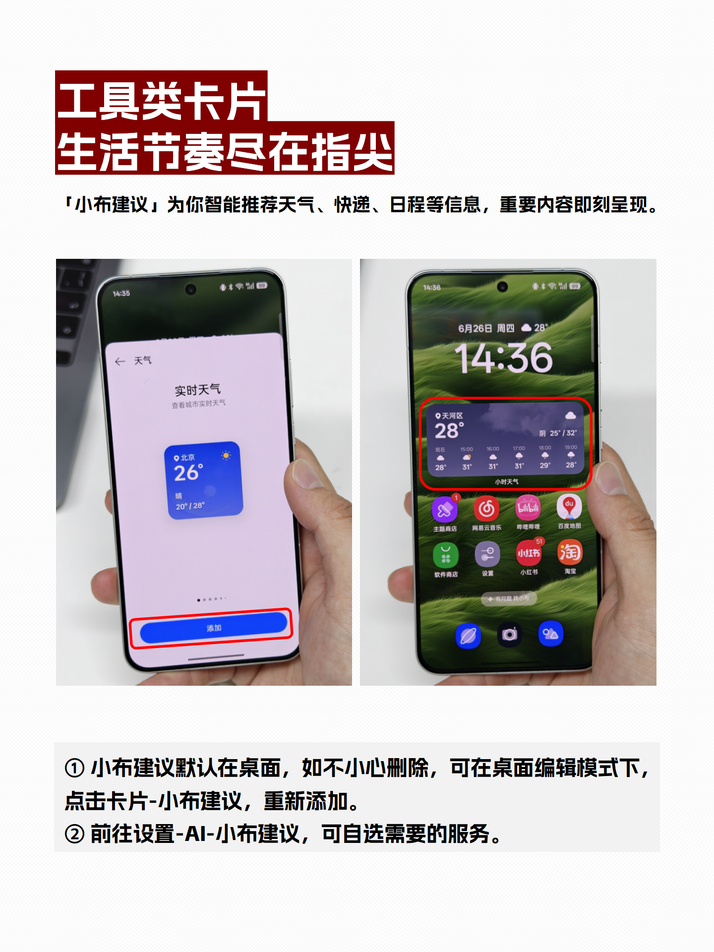 ✏️重新添加方法:若不小心删除,可在桌面编辑模式下,点击“卡片”,选择“小布建议”重新添加。