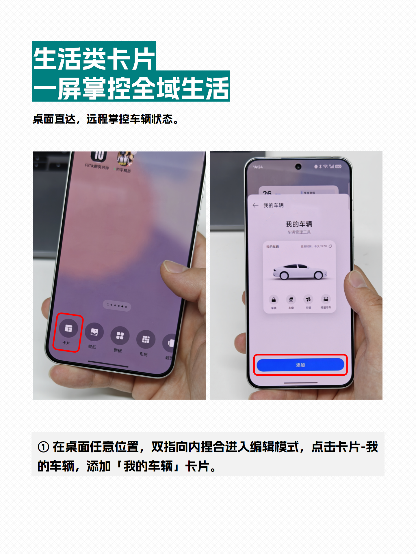 ✏️添加方法:在桌面双指向内捏合进入编辑模式,点击“卡片”,选择“运动计步”卡片添加。 - 🚗我的车辆卡片:远程掌控车辆状态,提前启动暖车或降温✏️添加方法:在桌面双指向内捏合进入编辑模式,点击“卡片”,选择“我的车辆”卡片添加。 -