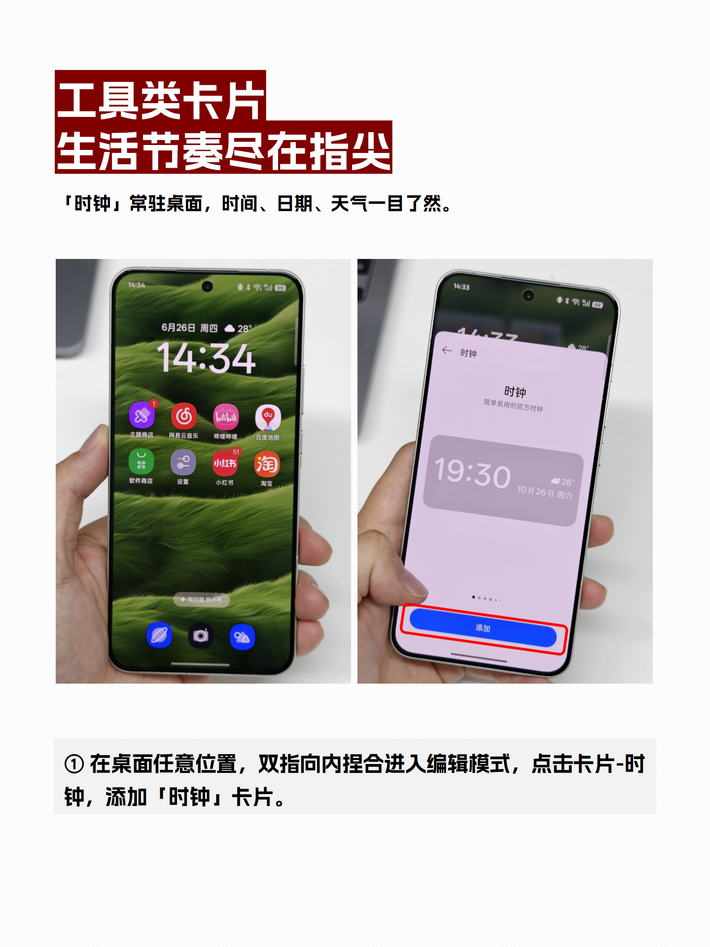 ✏️添加方法:在桌面双指向内捏合进入编辑模式,点击“卡片”,选择“时钟”卡片添加。 -