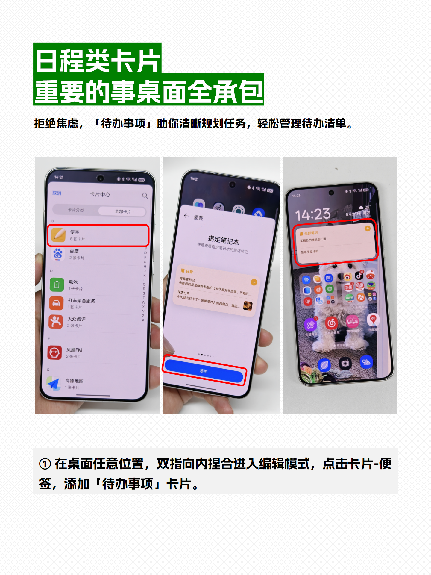 ✏️添加方法:在桌面双指向内捏合进入编辑模式,点击“卡片”,选择“便签”,添加“待办事项”卡片。 -