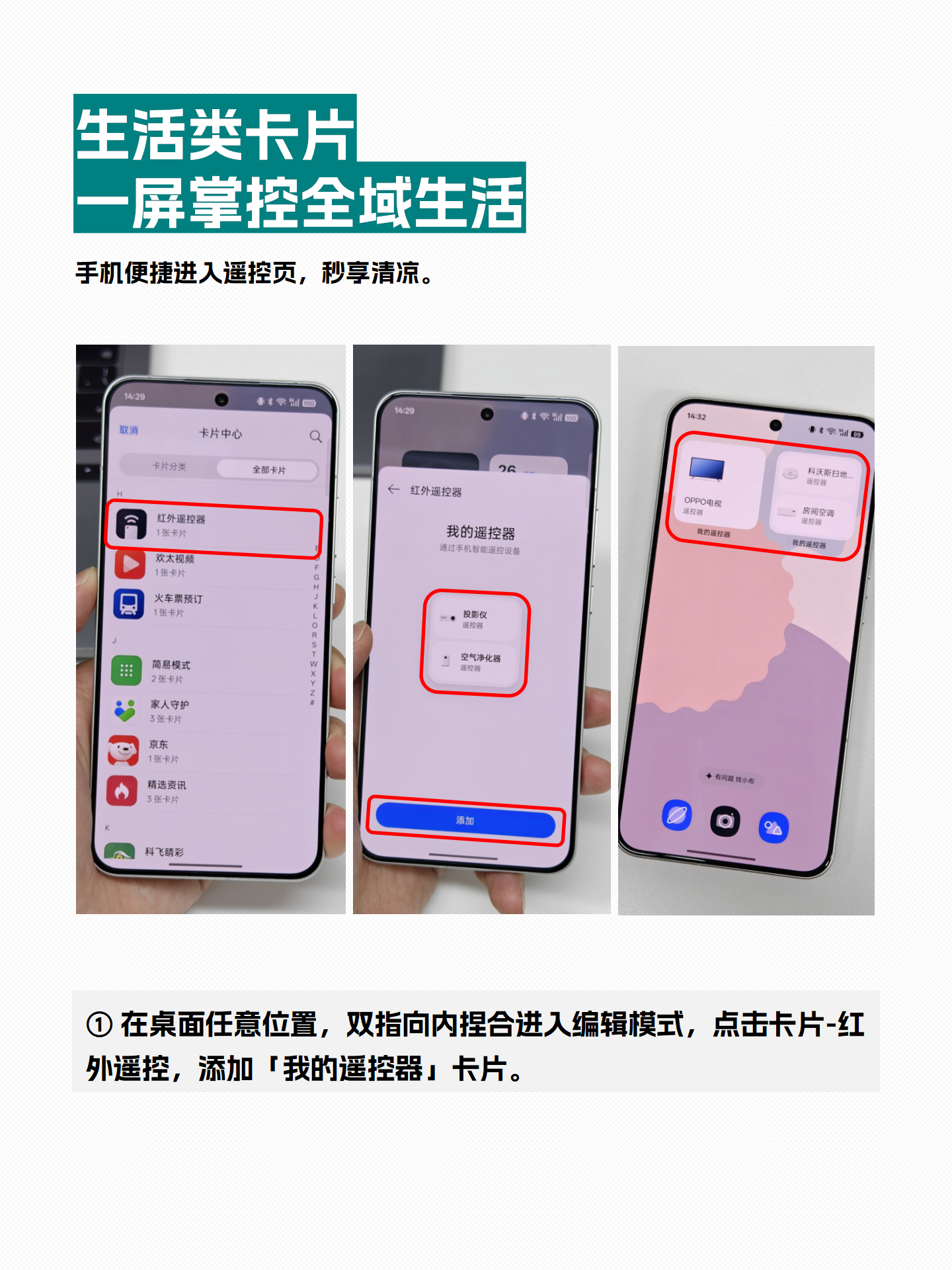 ✏️添加方法:在桌面双指向内捏合进入编辑模式,点击“卡片”,选择“红外遥控”卡片添加。 -