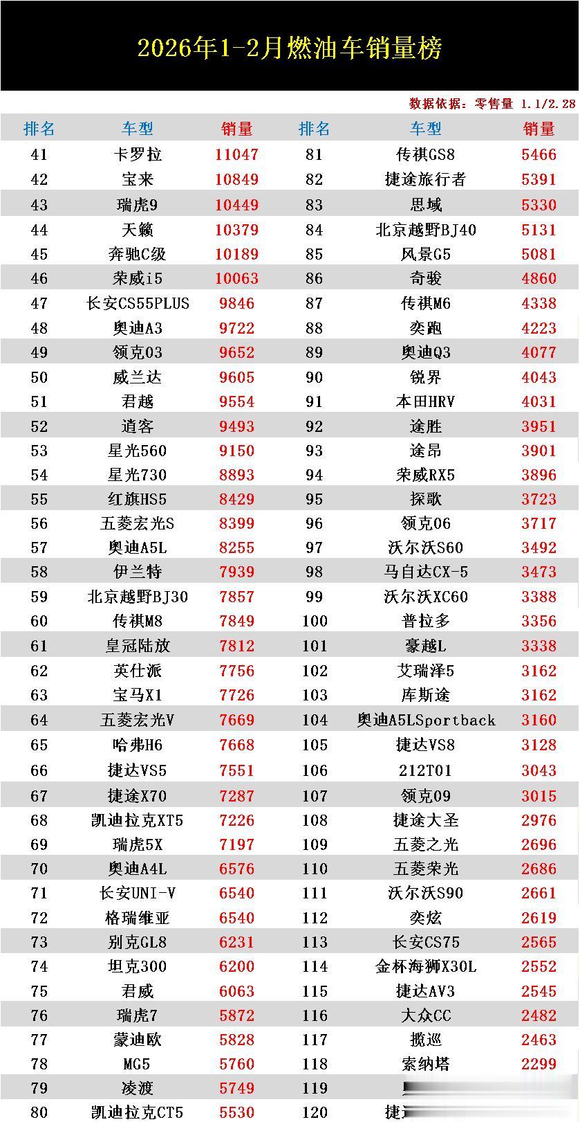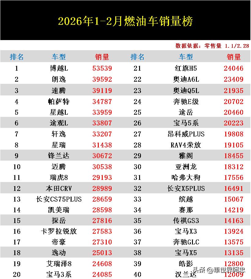 导读:今年前两个月(1-2月)燃油车零售量排行榜已正式出炉了!虽然这两个月属于汽车市场的传统销量淡季,但燃油车市场依然有不少车型拿出了惊人的销量表现。