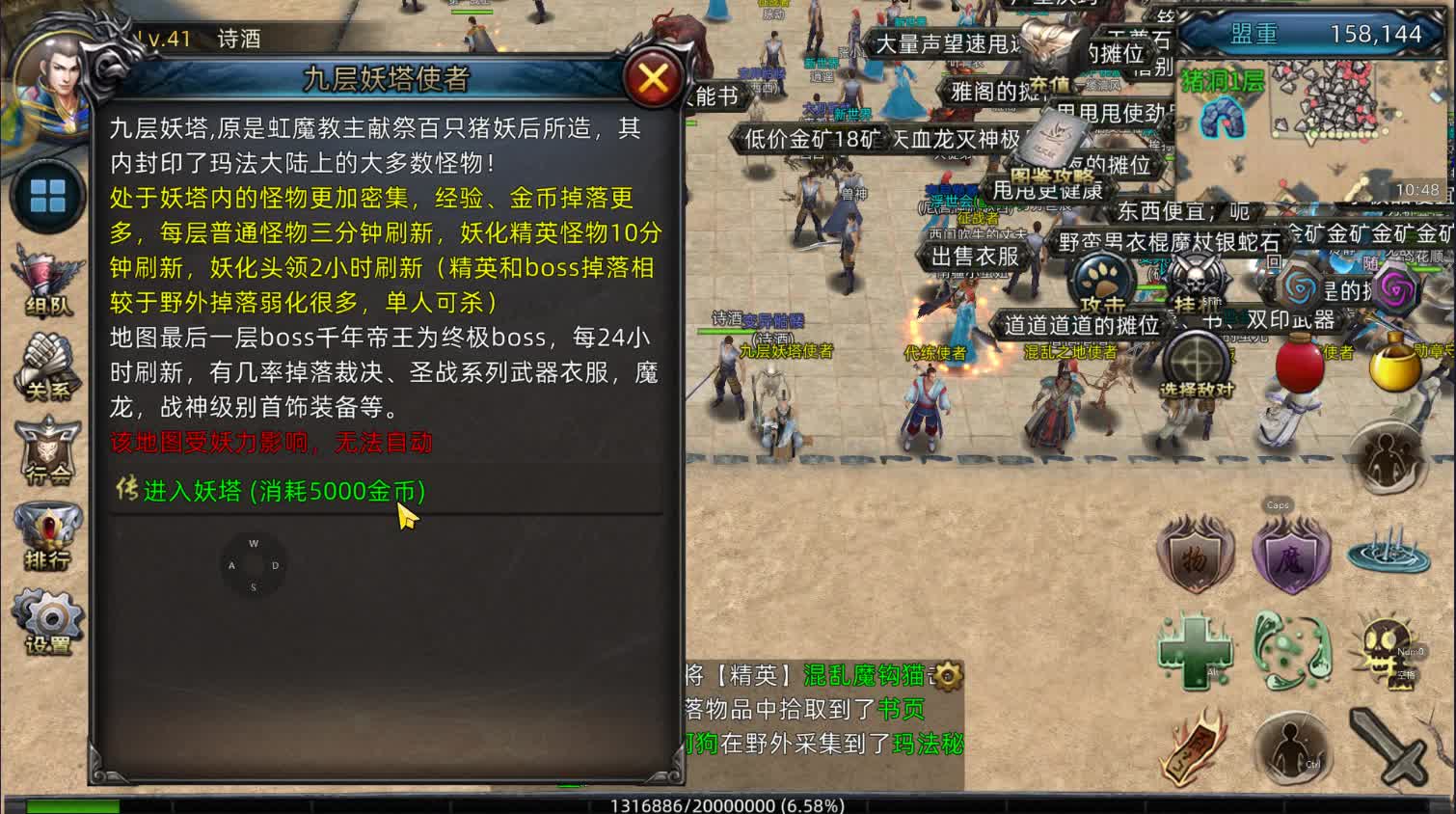 传奇传世千千万,推荐还看老皖谈。大家好,我是老皖,今天,老皖又来说给兄弟们更新新的下饭操作了,这不,游戏又更新了一波,站在最下面的NPC里多了一个叫九层妖塔使者的人,嗯,是一个没见过的,我都迫不及待去帮兄弟们探一探了,门票是5000金币,注意这里是金币,不是绑币,虽然说是用金币,但是5000金币还真的不贵,属于我们这不充钱玩家也消费得起。