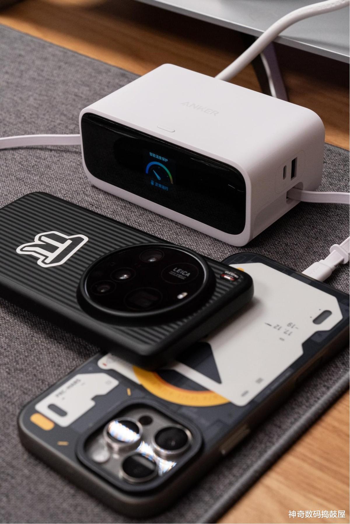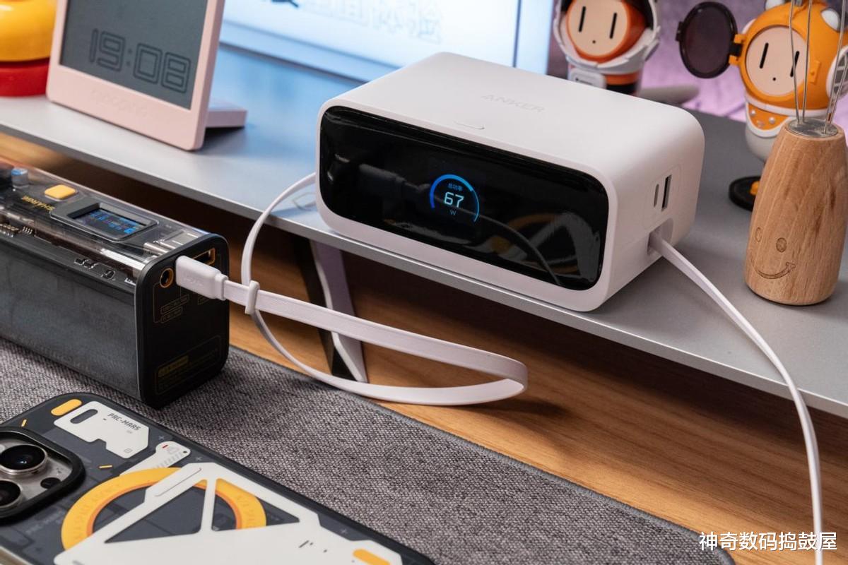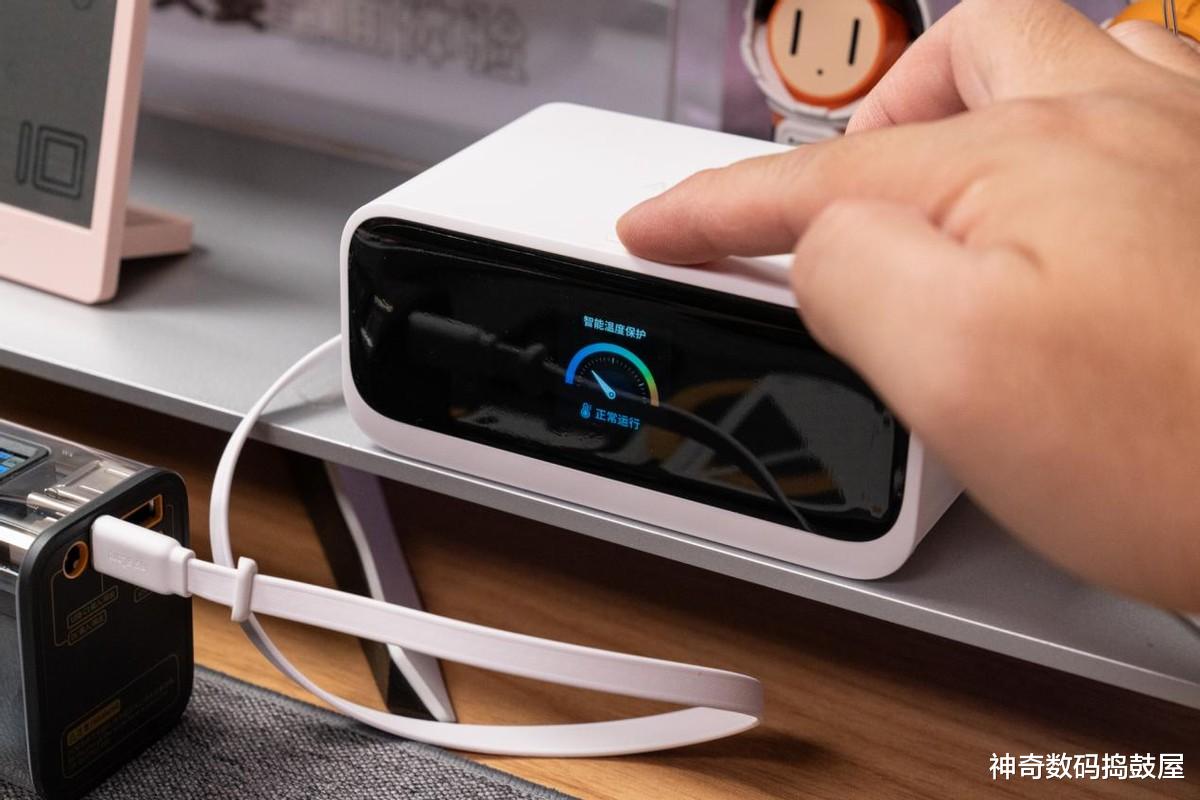 哎呀,自带线还不够!Anker Nano桌面充Mix还有个特别牛的亮点——前面板带了一块1.3英寸小彩屏。这块小屏幕虽然不大,但上面实时显示着充电功率啊、温度这些信息,就跟看仪表盘似的。咱们不用再瞎猜了,随时瞟一眼,手机、耳机充得咋样了,清清楚楚,贼方便!
