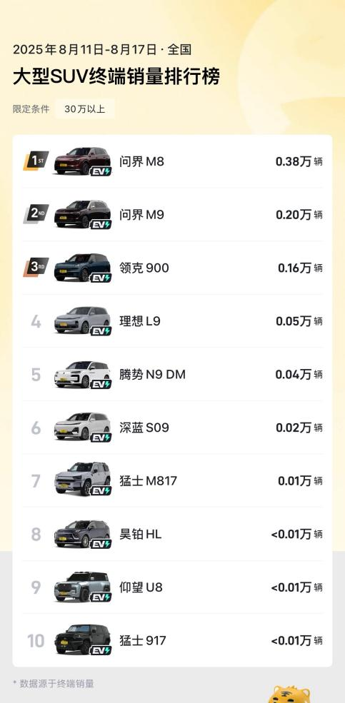 市场上,受欢迎的车型,往往更懂用户需求。领克900同样如此,上市百天累计交付破两万台,8月11日—8月17日周销量达0.16万辆,在全尺寸高端混动SUV领域妥妥的“现象级”存在,还连续三个月稳居该细分市场销量前三。