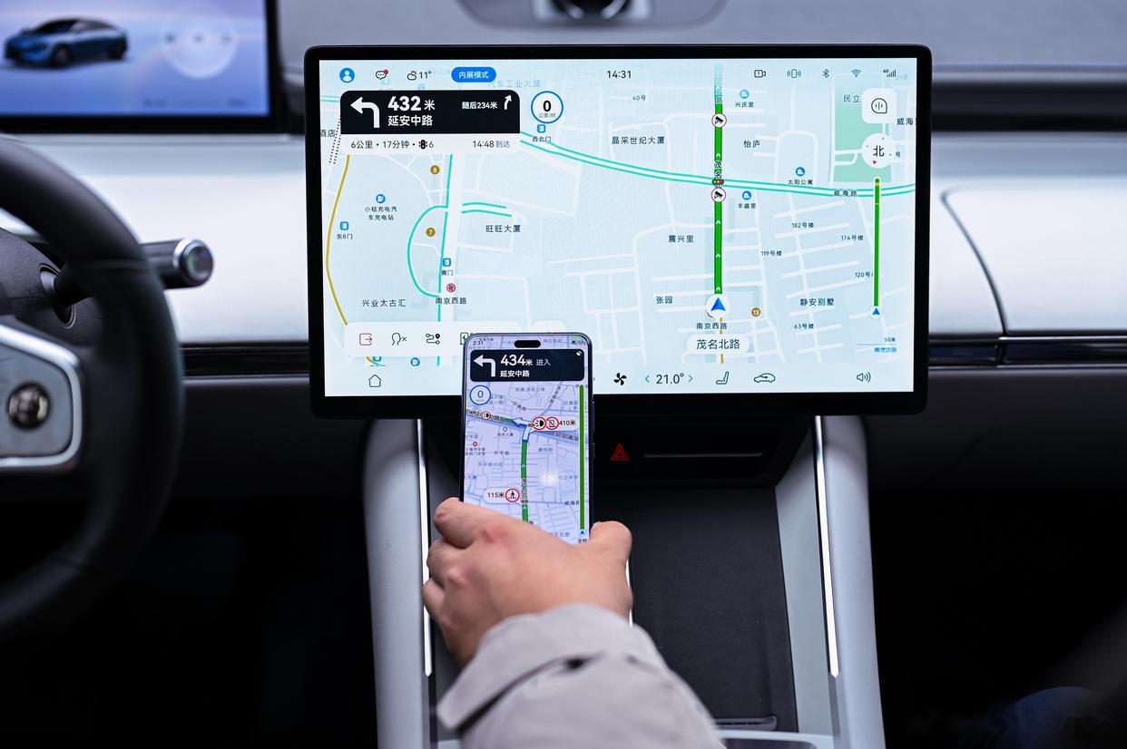 不过一上高速,情况就反过来了。我习惯把目光放在车机大屏上,因为高速路段主要看整体路线,高速出口、服务区、绕行路线这些信息在大屏上显示更直观。车机大屏比手机大,显示路线全貌一目了然,驾驶过程中眼睛移动幅度小,安全性更高。而且高速行驶,信号不稳定时,车机自带地图依然能正常导航,不会像手机因为信号问题突然掉线或者卡顿,这对长途驾驶来说很重要。