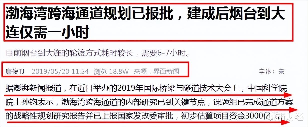 2019年,澎湃新闻曾披露过,渤海湾跨海通道的内部研究已到关键节点,课题组已完成通道方案的战略性规划研究报告并已上报国家发改委审批,初步估算项目资金3000亿元。