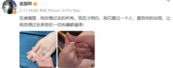 今年5月17日凌晨,俞灏明晒出了钻戒和两人拉钩的照片,配的文字更是深情。
