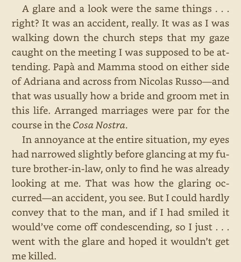 因为事情闹得不算小,大部分人开始觉得她不洁——天杀的, 我看到这个的时候反复回看时间,确认现在是2025年,而不是1805,而且这还是现代小说啊!!!!!!你们黑手党家族有毛病吧