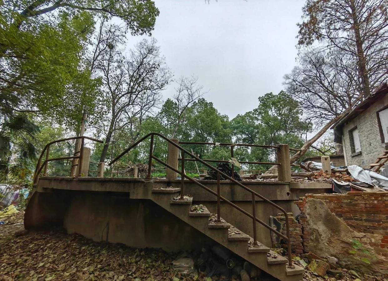 圆形平台保留原装铁栏杆,北侧两栋建筑疑似当年研发车间