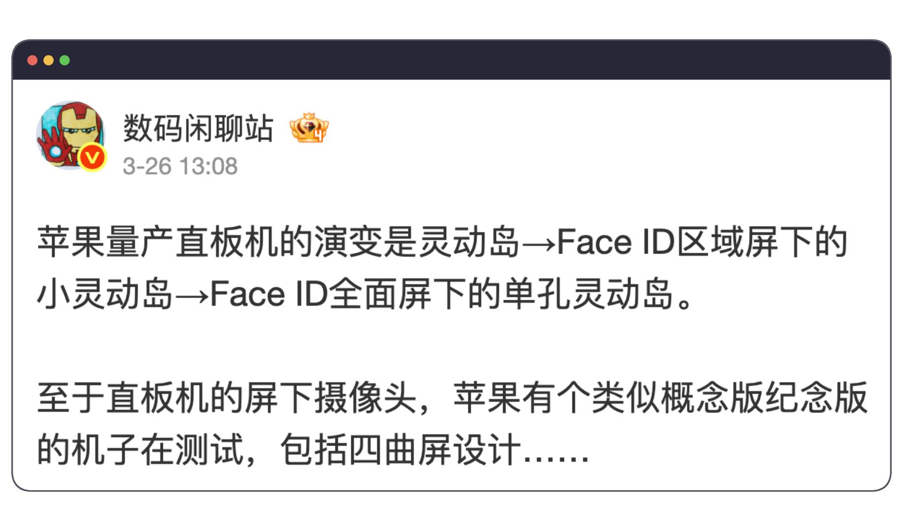 同时,更窄的灵动岛显然也只是过渡方案。苹果的最终目标,依旧是实现真正的全面屏设计,将 Face ID 和前置镜头完全隐藏至屏幕下方。