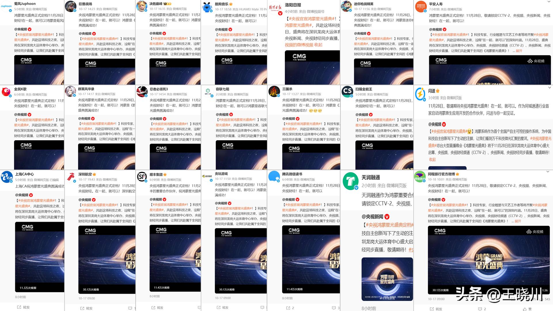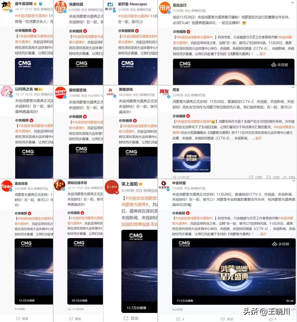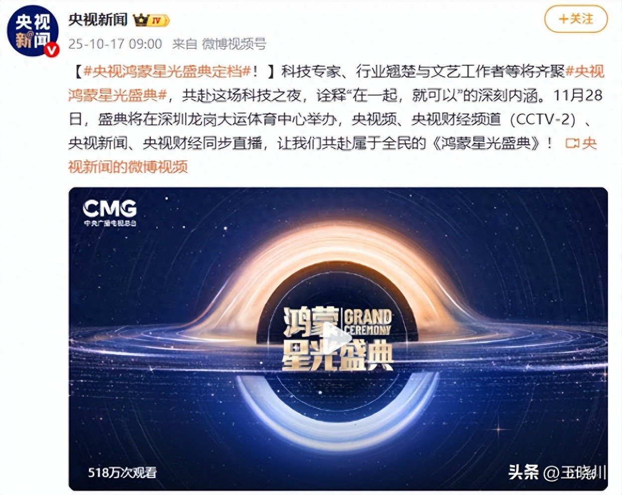 就在上周五,央视新闻官方微博官宣了将于11月28日举办的总台大型直播晚会《鸿蒙星光盛典》。这个消息一出,就迅速获得了多家鸿蒙生态伙伴的积极响应与转发,一场属于整个中国科技圈的狂欢正在拉开帷幕。