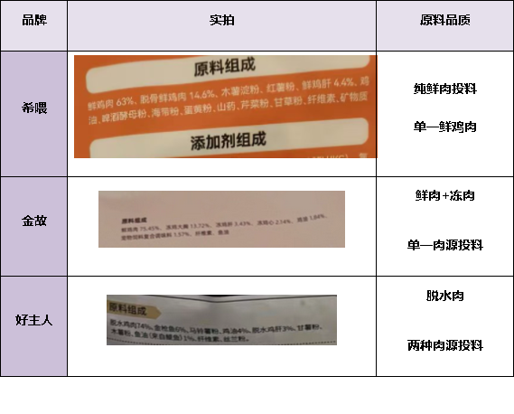 金故这款猫粮只用了鸡肉一种肉源,种类有鲜肉和冻肉两种,提供的动物蛋白基本符合包装袋标注的营养值。