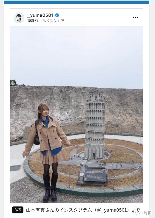 当天山本有真似乎去了"东武世界广场",并回顾道"红叶太美了,迷你世界也真的很好玩"。在Instagram发布的照片中,山本有真穿着短款风衣搭配迷你百褶裙套装。外套是米色的,里面搭配了蓝色衬衫。此外,还展示了搭配透视感打底裤和长靴的全身照。