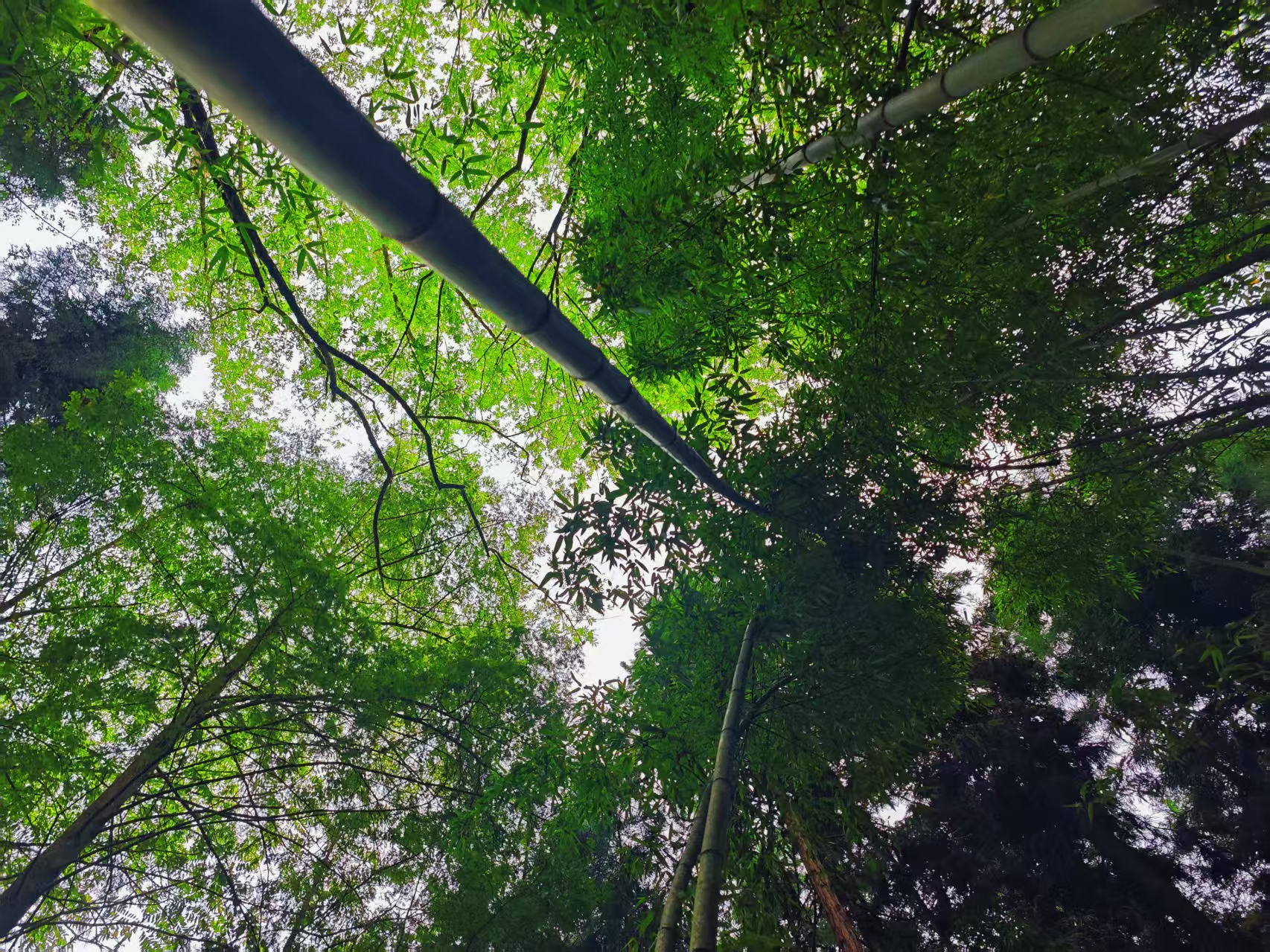 休息片刻后,我沿着另一条更陡峭的小径往上走。抬头仰望,粗壮的枝干如手臂般伸展,撑起一片浓密的绿色天空,枝叶相互交织,将湛蓝的天空切割成不规则的碎片。阳光艰难地穿过枝叶的缝隙,在地上留下零星的光斑,像撒了一地碎金。偶尔有几只画眉鸟从枝叶间掠过,灰褐色的身影一闪而过,留下几声清脆婉转的啼鸣,紧接着便有山雀的啾啾声回应,为这片寂静的山林增添了生机与活力。行至一处岩石旁,忽见几只通体翠绿的竹节虫趴在叶片上,细长的身体与竹枝融为一体,若不是它轻轻晃动了一下触须,险些便错过了这天然的 “伪装者”。