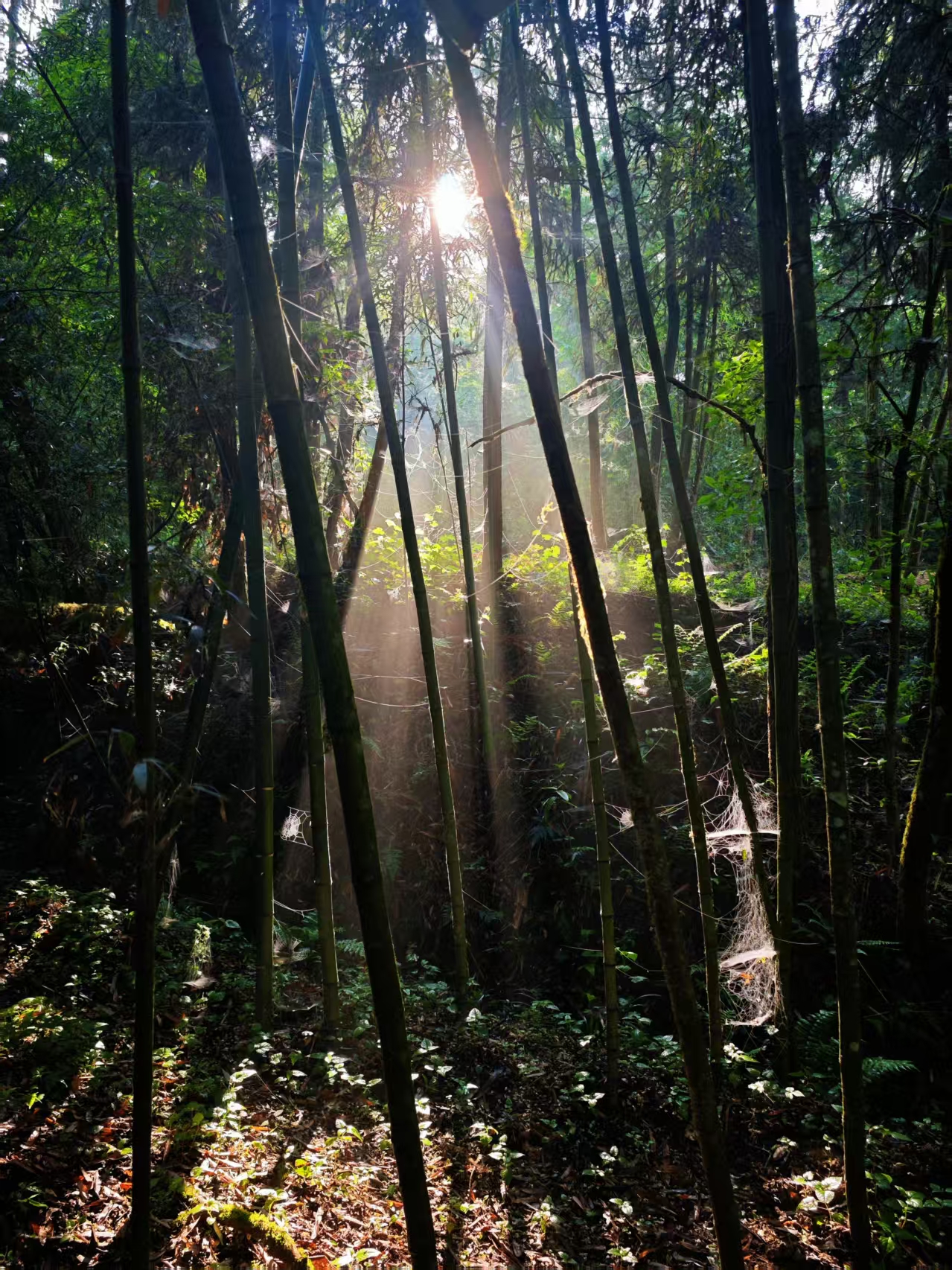 离开山屋,继续向山林深处走去,眼前渐渐出现成片的毛竹。阳光从层层叠叠的竹叶间洒落,形成一道道金黄的光柱,宛如大自然精心布置的舞台灯光。光柱里,细小的尘埃与竹屑在缓缓舞动,偶尔有粉白色的竹花飘落,穿过光柱时便染上一层暖光,为这片竹林增添了几分灵动与梦幻。竹子足有两三层楼高,竹身泛着青黑色的光泽,靠近根部的地方还留着去年的竹节痕,像一圈圈年轮。竹叶浓密得能遮住大半天空,相互交错间,在地上投下斑驳的光影,随着风动不停变幻形状。偶尔有风吹过,竹叶 “沙沙” 作响,夹杂着竹身轻微的晃动声,似在低语,那声音轻柔而舒缓,与山林间偶尔传来的虫鸣相得益彰。走累了便靠在竹身上歇息,能感受到竹身传来的细微震颤,仿佛与这片竹林的呼吸同频。