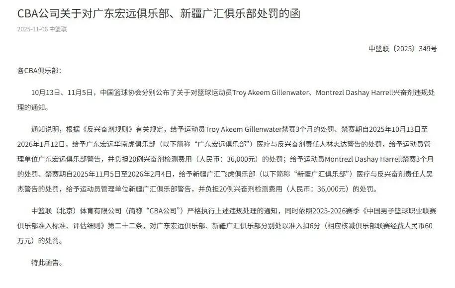 无独有偶的是,前广东男篮内线外援吉伦沃特也因为违禁品违规被篮协禁赛了3个月,同时广东男篮俱乐部也将承担3.6万元的罚款。不过篮协是在十月中旬对吉伦沃特和广东男篮进行的处罚,之所以才对哈雷尔和新疆男篮俱乐部处罚,主要原因是哈雷尔给出的相关证据在核实当中,所以篮协先公布了对吉伦沃特和广东男篮俱乐部的处罚决定。