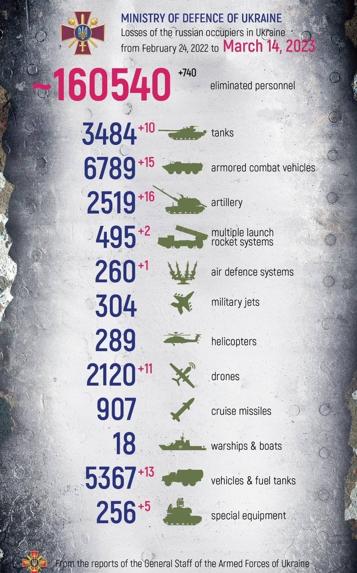 3月14日,乌克兰武装部队总参谋部报告说,自去年2月24日俄罗斯开始全面入侵乌克兰以来,俄罗斯在乌克兰损失了160,540名士兵。