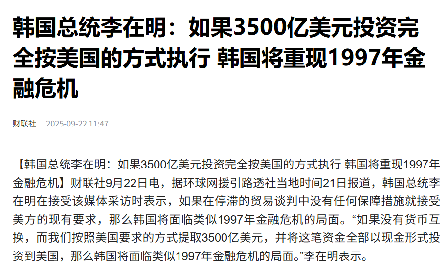 另一方面,尽管特朗普如此自信,但韩国方面却非常的悲观,由于韩国自身的经济体量要远远小于美国,就连韩国总统李在明都不得不承认,如果美国一下子让韩国交出3500亿美元,那么韩国就会陷入到比1997年亚洲金融危机更严重的状况,导致美韩之间的谈判依旧难以推进。