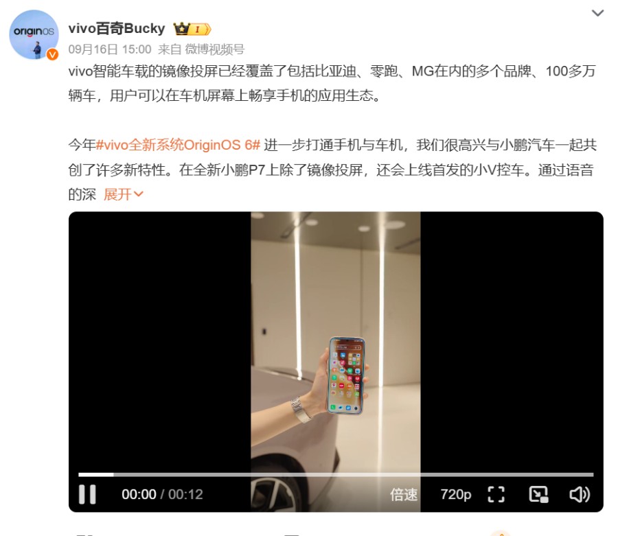 不光性能强,OriginOS 6在颜值上也下了功夫。重点强化了光影感和空间感,以后玩手机,眼睛可能会更舒服。OriginOS 6最让人惊喜的,是把朋友圈扩展到了更多设备。现在手机镜像投屏已经支持比亚迪、零跑等多个品牌超100万辆车,车机屏幕直接用手机App生态。而和小鹏汽车的合作更有亮点, 全新小鹏P7上,除了投屏,还首发小V控车功能。