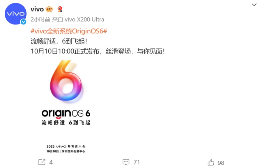 9月17日,vivo正式官宣全新操作系统OriginOS 6将于10月10日和大家见面,旗舰机型X300系列将首发预装。从目前透露的信息来看,这代系统不仅把流畅做到了新高度,还能和汽车、电脑互联,小鹏车主更能先享隔空控车,属实有点东西。