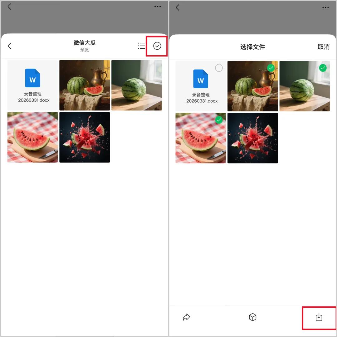 预览时,用户可以切换视图,支持以“列表”或“缩略图”方式浏览所有文件内容;同时还支持单选或多选,进行内容转发、收藏,或下载保存。