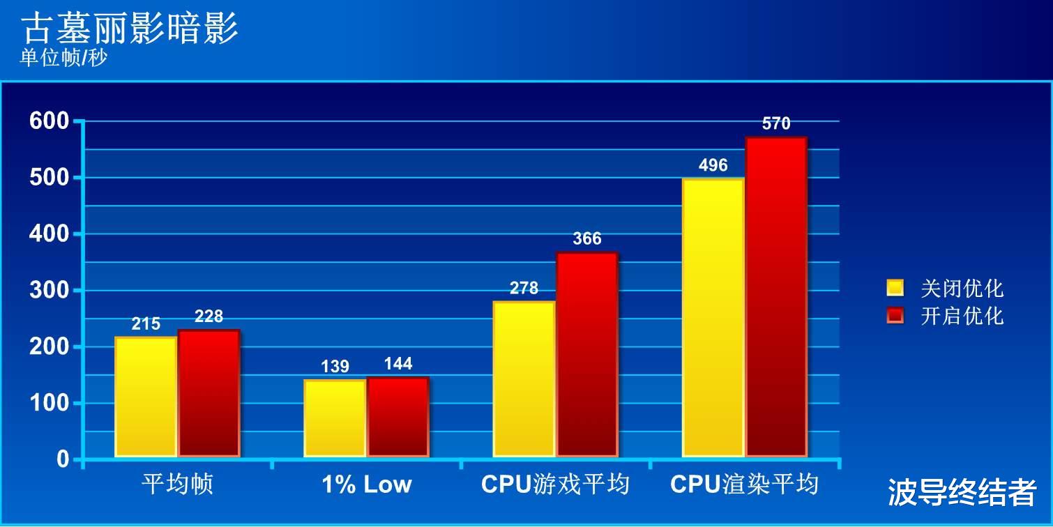在较老的古墓丽影暗影中,游戏帧数瓶颈已经不在显卡,但开启优化之后仍然能获得帧数提升。平均帧率由215提升至228,1% Low帧由139帧提升至144帧。并且在CPU游戏和CPU渲染的子项目当中,分数均有相当大的涨幅。