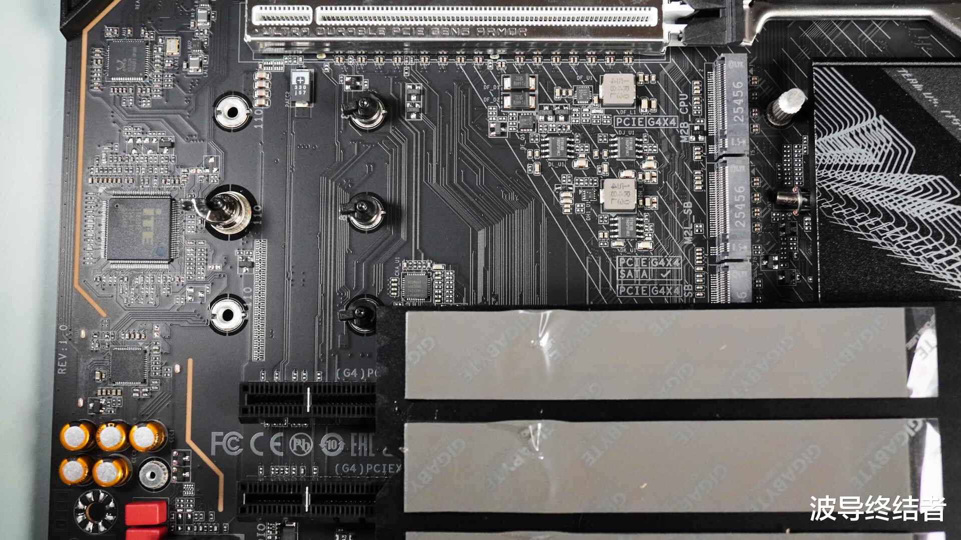 而在这底下,还有3个PCIe4.0 x4的固态硬盘位,共享同一块大的散热马甲,不过就没有弹性背板了,但是包装内有3组垫片供使用。如果使用原装的散热片,会占用左侧的22110卡扣,3块固态能上到最常用的2280,如果有极特殊需求,改一下卡扣到22110再单独使用散热片也是可以的。其中上面这条插槽直通CPU,下面这条则是支持SATA协议盘片,中间这个槽位与最下面的PCIe X16共享带宽。