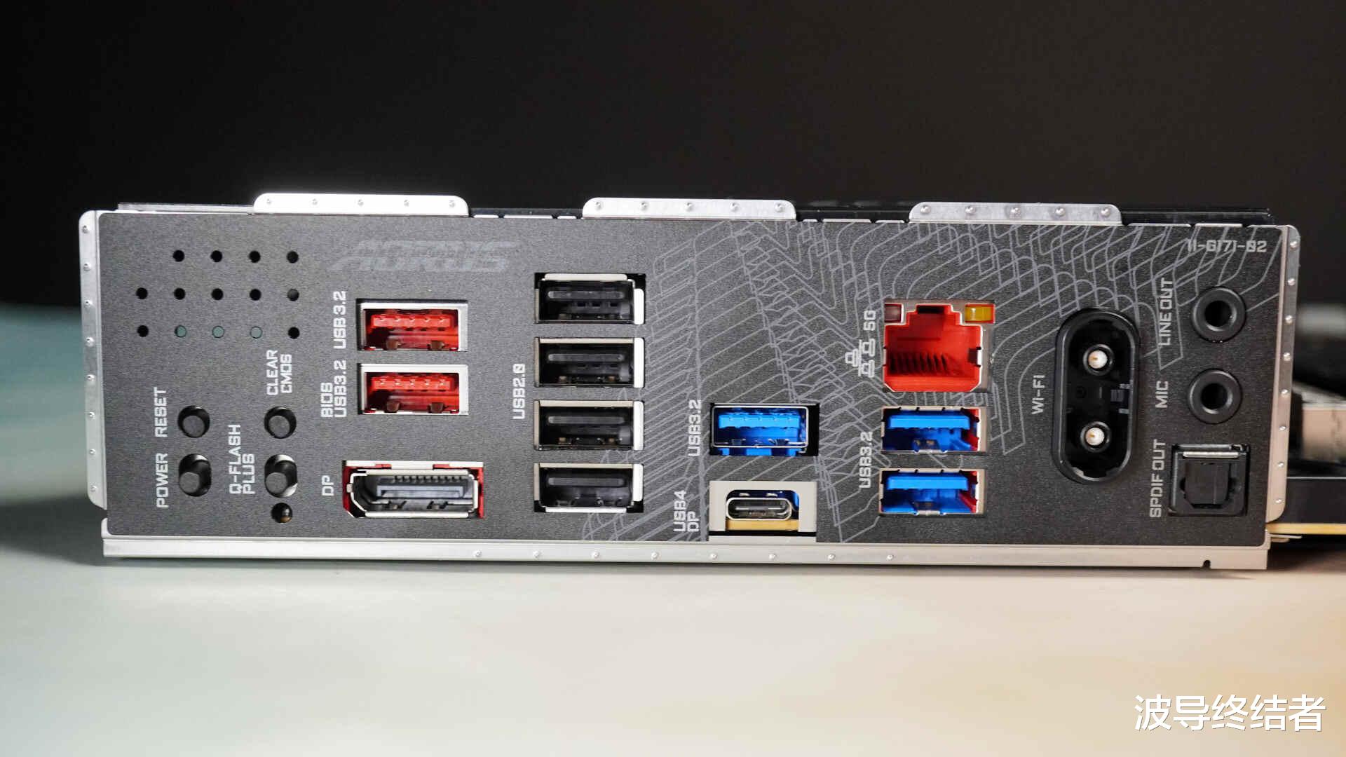 可以看到,在内部接口上,技嘉Z890 AORUS  ELITE DUO X 小雕已经是相当豪华,能给的都给了。而在背板规格方面,也是相当给力。上面的4个按键,分别是POWER,RESET,Q-Flash Plus,CLEAR CMOS,对于频繁折腾的玩家非常实用,旁边还留了散热出风口。黑色的USB2.0有4个,接无线外设的适配器非常实用;蓝色的USB3.2 Gen1 5Gbps有3个,红色的USB3.2 Gen2 10Gbps有2个。再加上40Gbps带宽的USB4 Type-C全功能接口,支持视频输出,与另一个全尺寸的DP口可以组成双显输出。