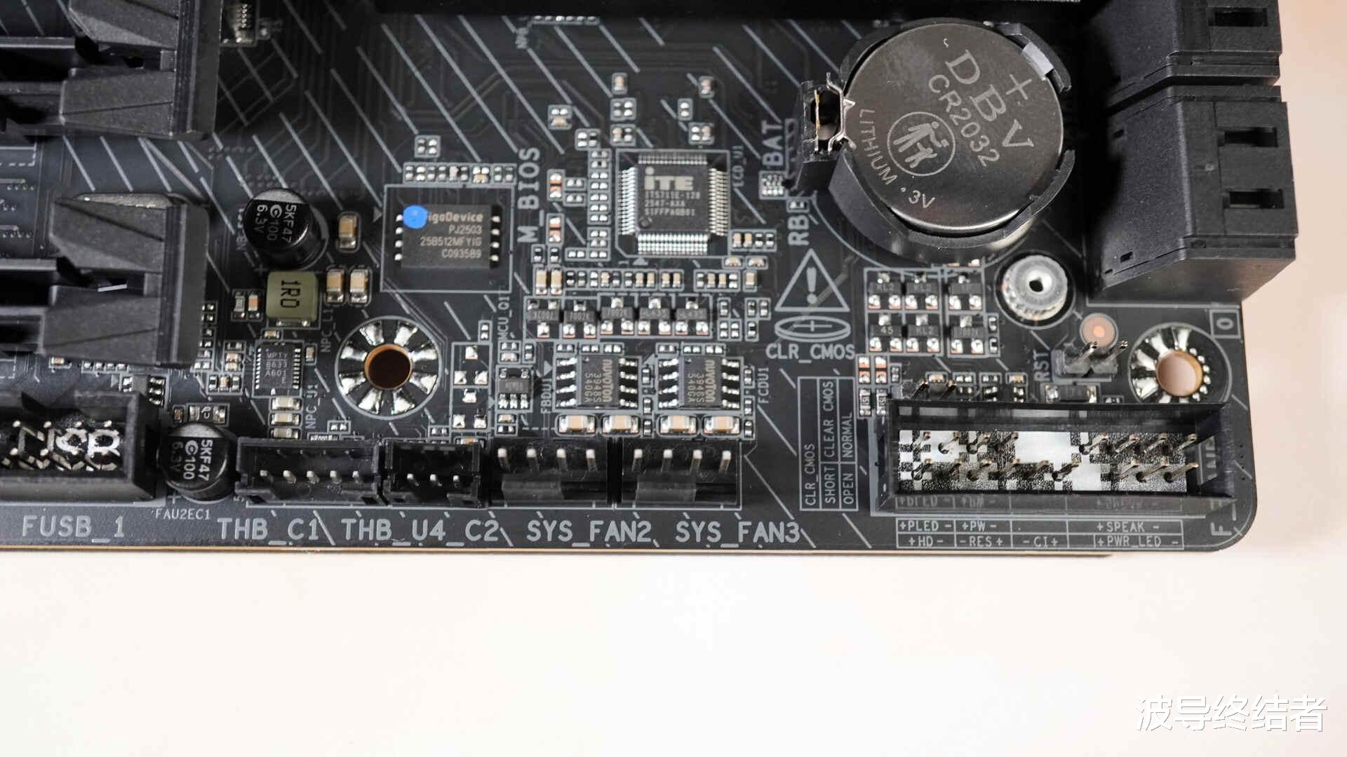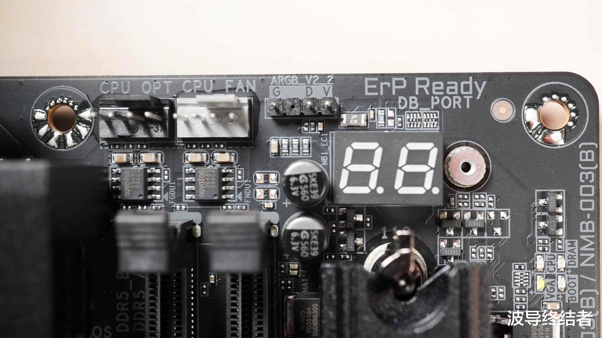 看回主板,右上角安排了CPU水泵、风扇和3针ARGB灯光接口各一个,平时安装散热走线就特别容易。同时DEBUG灯与DEBUG LED数显都作了保留,平时用DEBUG看个大概,如果遇到疑难问题再查具体的状态编号。而POWER和RESET按钮,则从主板移到了背板,更加实用,等下到背板的时候再一起看。