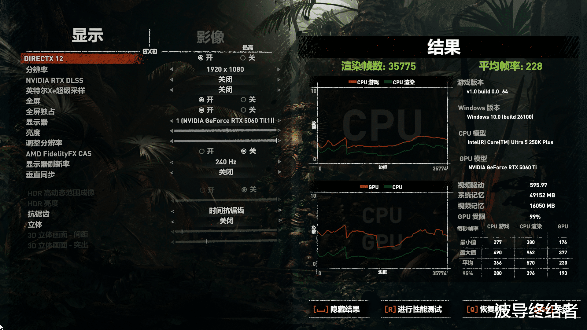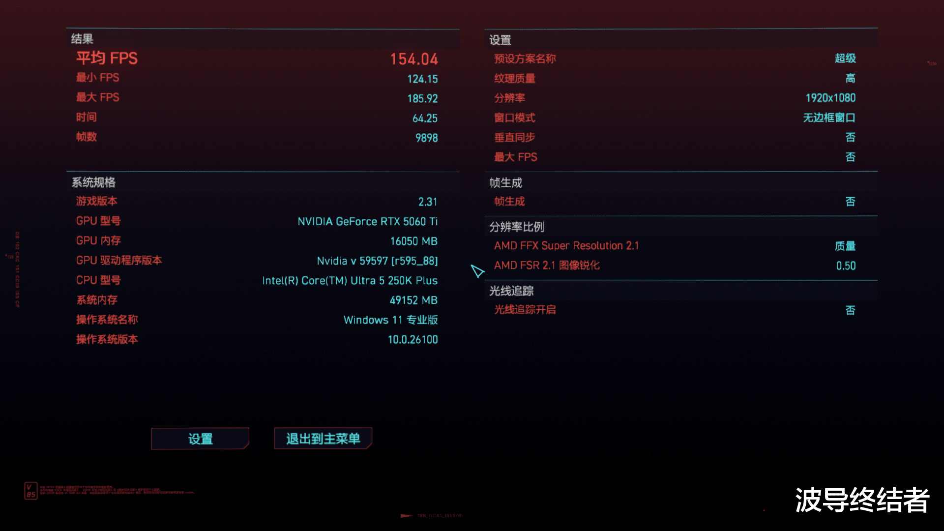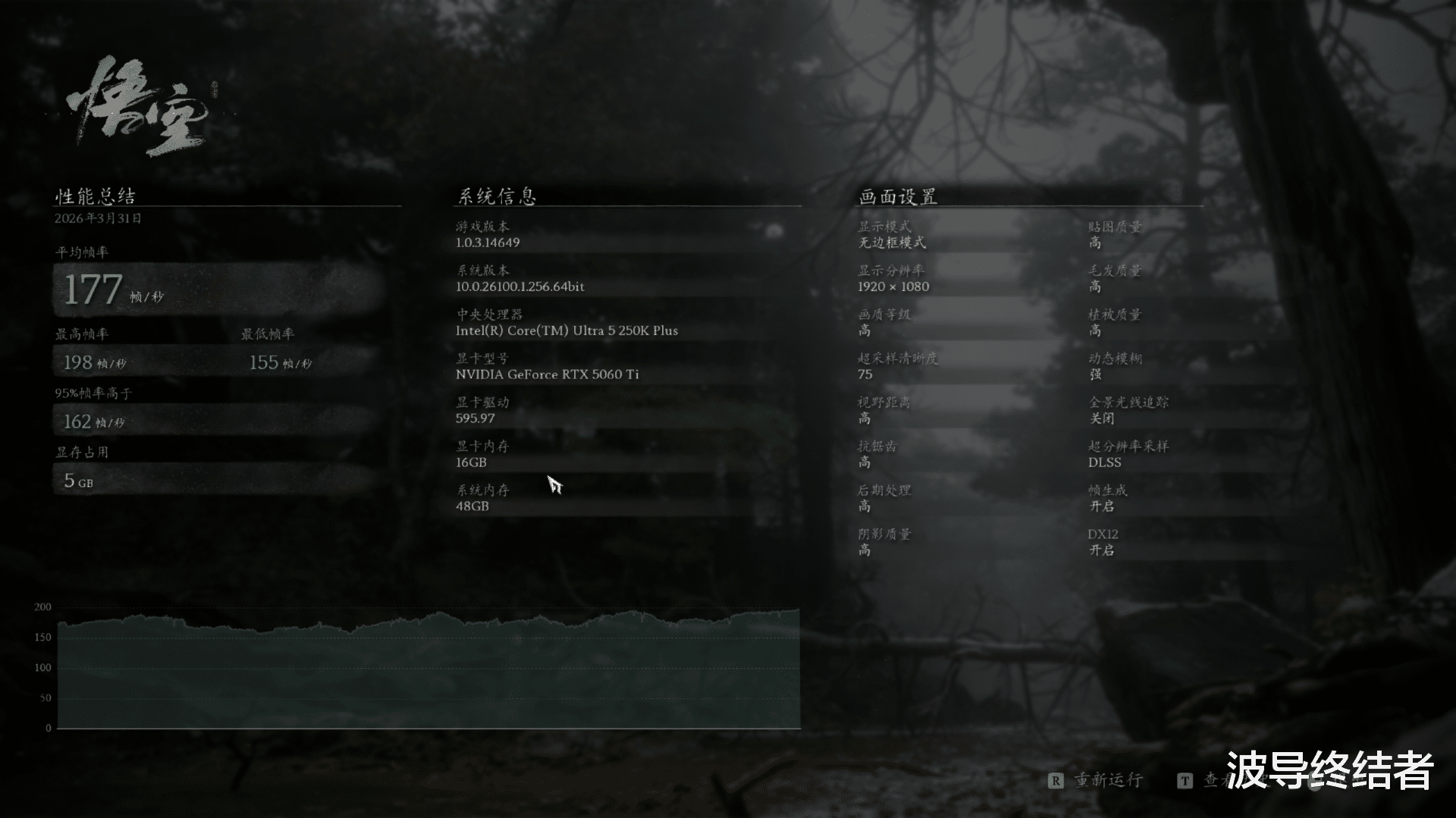 再来跑跑其它项目,黑神话悟空所用的引擎较新,能享受到50系显卡的帧生成加成,以及最新的DLSS4大模型。5060Ti高画质,DLSS超采样率75,就能跑出177的平均帧率和155的最低帧率,表现非常稳定。