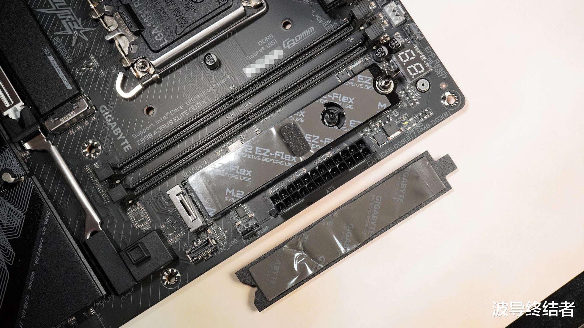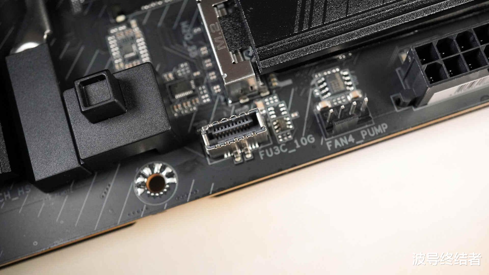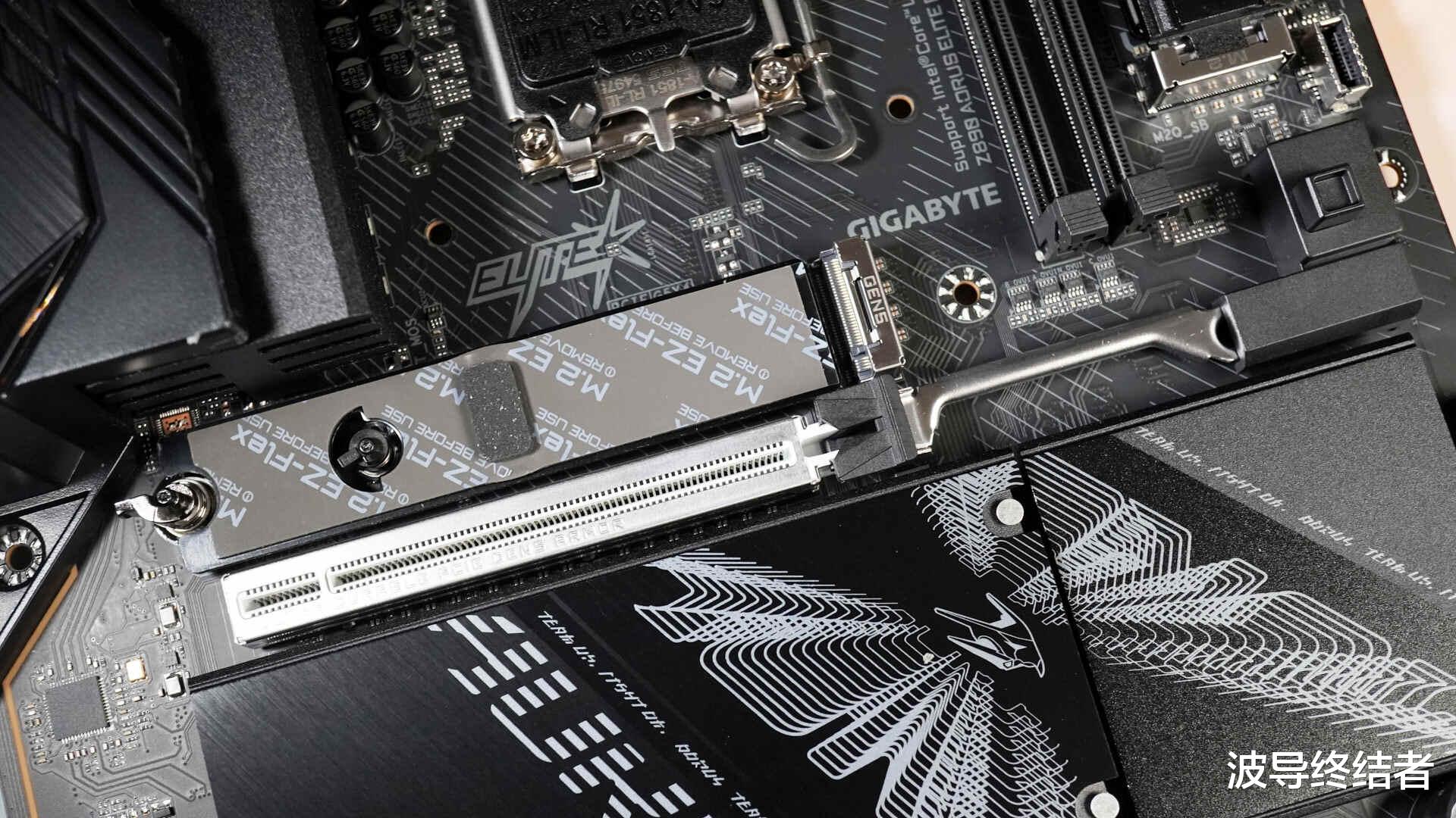 而显卡的接口,当然是金属装甲加固过的PCIe5.0 x4,随便跑满市面上的任何显卡。可以看到,它旁边的卡扣通过物理连杆与快拆按钮相连,需要拆下显卡时就不用再把附近的其他零件先拆掉了。说到附近的配件,显卡上方的这个固态接口也是PCIe5.0 x4,最大支持22110,直通CPU,并且也一样有弹性背板设计。