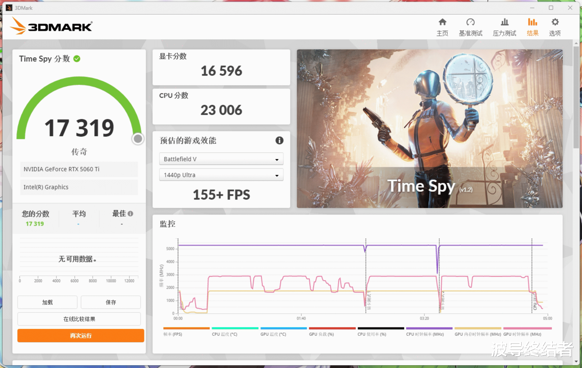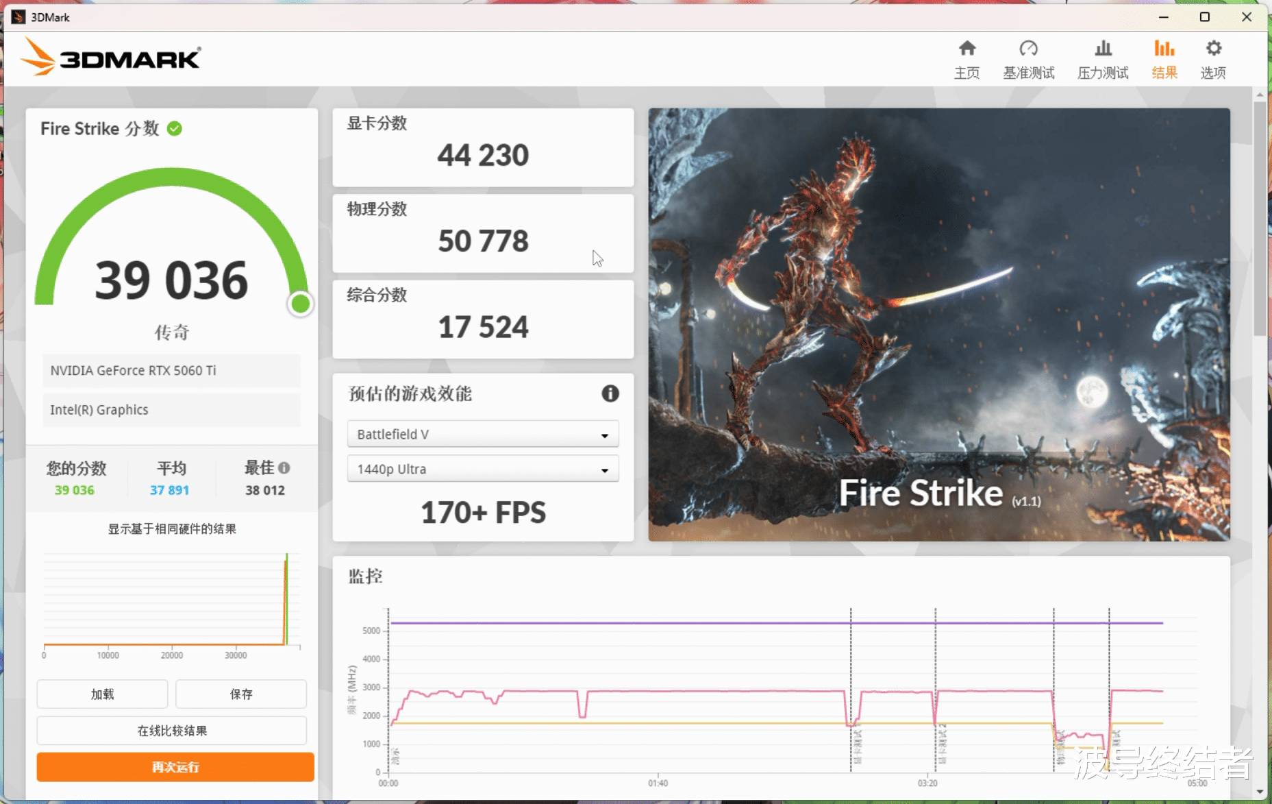 最后再来跑跑常规3DMark项目,TIME SPY里,综合得分17319,显卡得分15696,CPU分数23006;FIRE STRIKE项目中,综合得分39036,显卡得分44230,表现都非常不错。