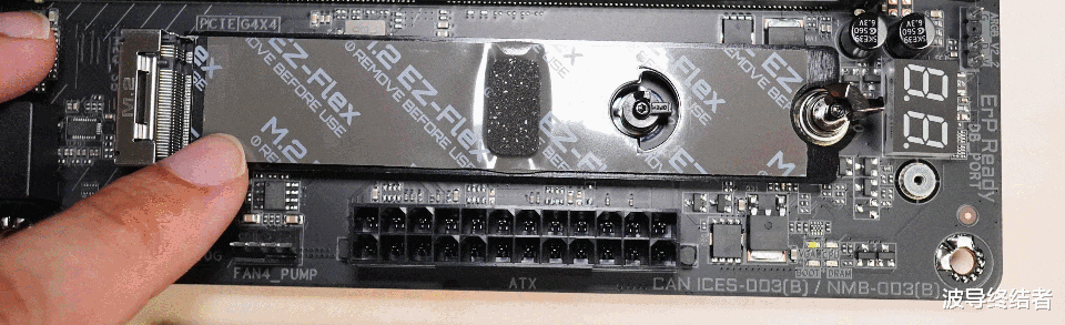 另一个小细节,就是这块主板的2个主要M.2插槽上,使用了弹性背板设计。浮动的幅度不大,刚好能使散热片的两面都紧贴固态硬盘,提供更好的散热性能。而且,这张板子的所有M.2固态硬盘都使用了免工具设计,散热片以及M.2硬盘的固定都不需要工具和螺丝,装机的时候非常顺手。内存槽旁边的这个硬盘位是直通南桥的PCIe 4.0 x4规格,支持最大到22110的盘,跑满4.0固态非常轻松。
