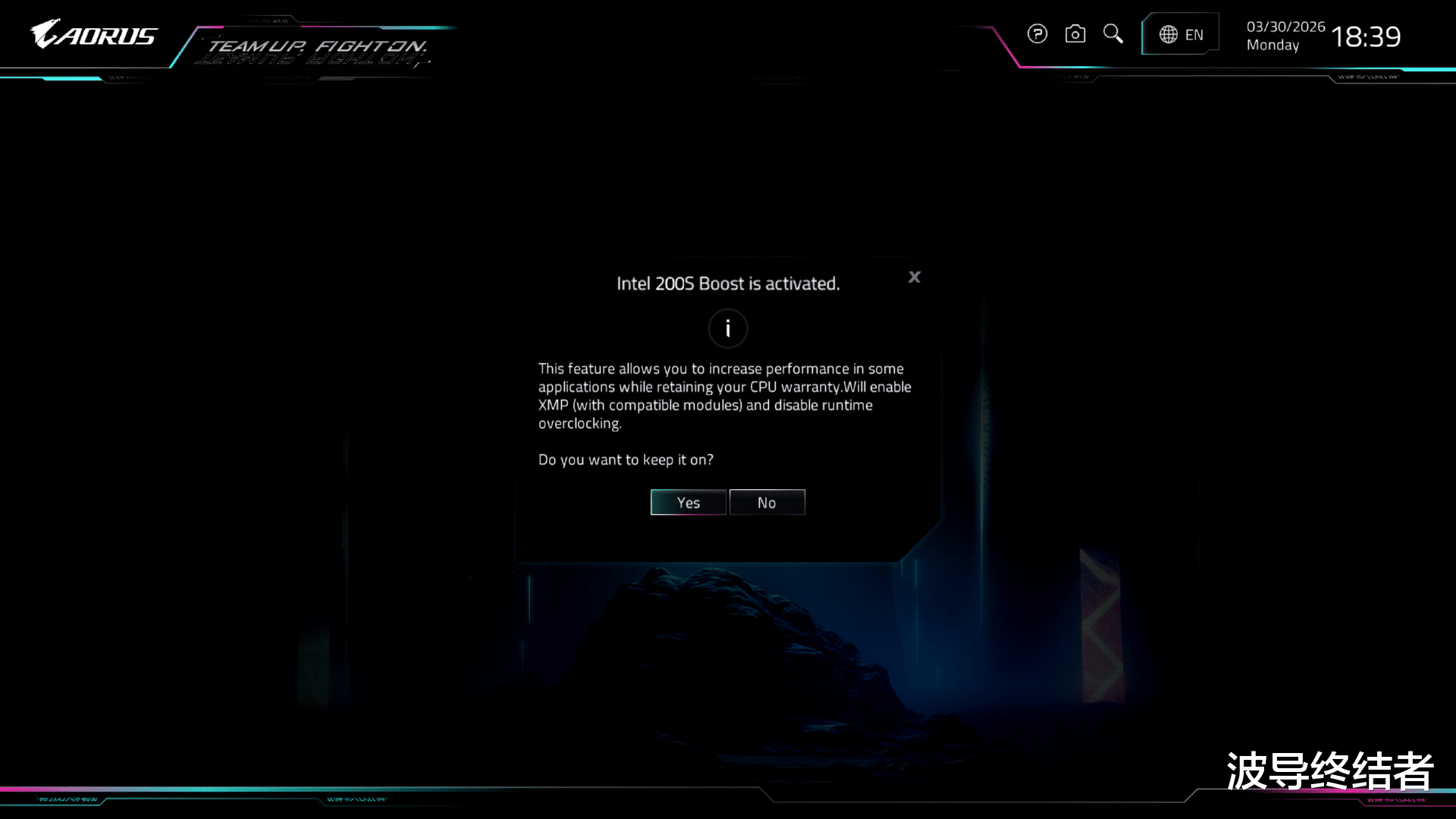 看完板子,我们直接来上机。一次点亮,第一次开机自检进BIOS,即提示检测到Intel 200S Plus,一般玩家自动开启200S Boost即可。