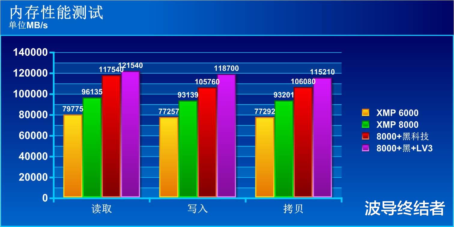 而在内存黑科技方面,带来的提升更是明显。在XMP 6000档位下,读取带宽为79775MB/s,写入带宽77257MB/s,拷贝带宽77292MB/s,延迟87.6ns。开启XMP 8000档位,读写带宽就分别来到了96135MB/s,93139MB/s,拷贝带宽93201MB/s,延迟78.4ns。再开启高带宽和低延迟功能后,读写以及拷贝带宽再次暴涨到117.54GB/s,105.76GB/s,106.08GB/s,延迟压进了70ns来到69.9ns。而在LV3档位下,CPU以及整机性能进一步提升,读取带宽高达121.54GB/s,写入带宽118.70GB/s,拷贝带宽115.21GB/s,延迟68.0ns。这一切都是在不做任何手动超频,仅仅BIOS里点两下得到的。