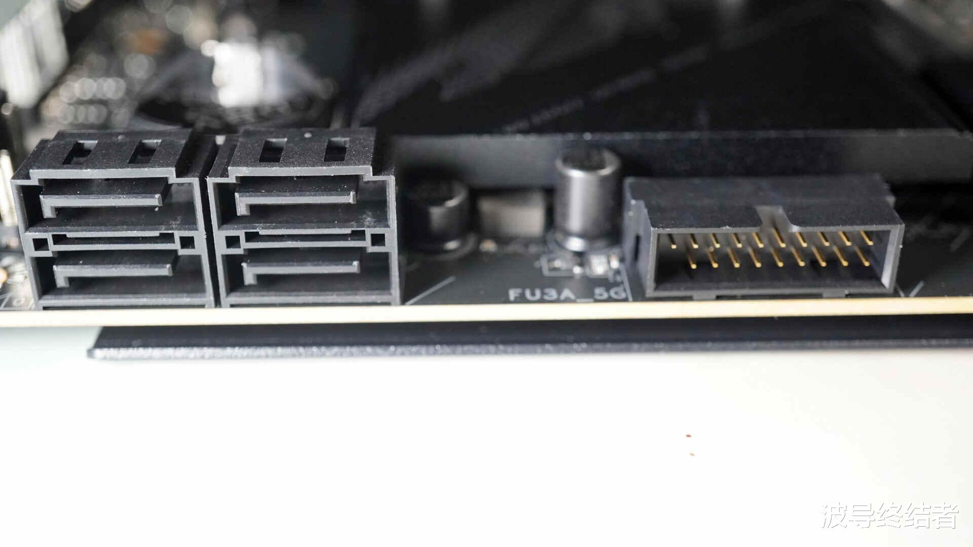 往下看,是4个SATA接口,以及老式的USB3.0 5Gbps扩展插槽。而且针对旧的USB3.0插槽朝天设计,既难拔插,又不好走线的问题(主板USB3.0前置接线往往又粗又硬),接口也是做了90度的旋转。