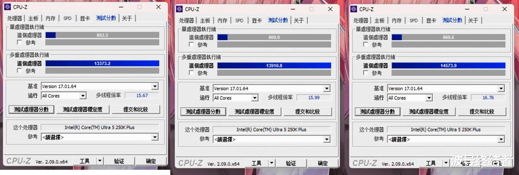 简单对比一下3个不同档位的CPU-Z跑分。LV1档位下,单核得分853.3,多核得分13373.2;LV2档位下,单核869.9分,多核13910.8分;LV3档位下,单核得分869.5,多核得分14573.9。这期间,整机运行稳定,250K Plus的能耗比相当出色,发热也很低,标称的PL1功耗125W,PL2功耗159W,散热随便都能压得住。