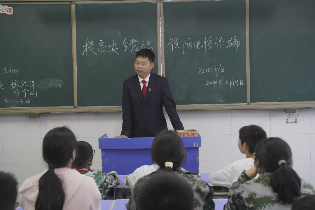 为进一步增强青少年防范电信诈骗的意识和能力, 10月9日下午,信阳市浉河区法院刑事审判庭法官助理王涛走进浉河中学,为初一年级的同学们带来了一堂题为 “提高安全意识,预防电信诈骗” 的生动法治课。