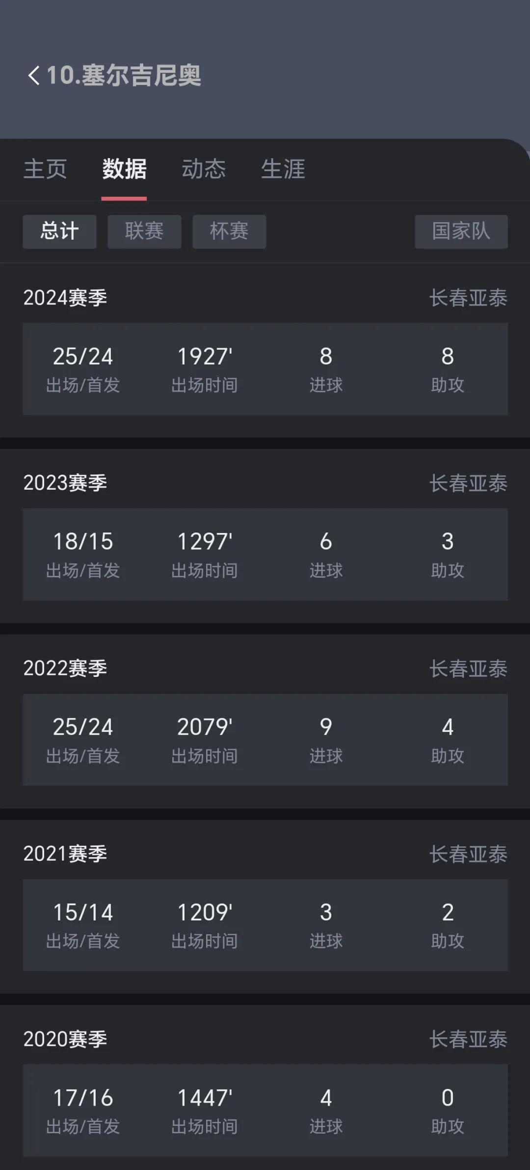 塞尔吉尼奥代表亚冠已经打了五个赛季,2024赛季有8个进球8次助攻,属于技术比较全面的球员,既有助攻又能进球。在亚泰五年,塞尔吉尼奥打了整整100场比赛,30个进球23次助攻。