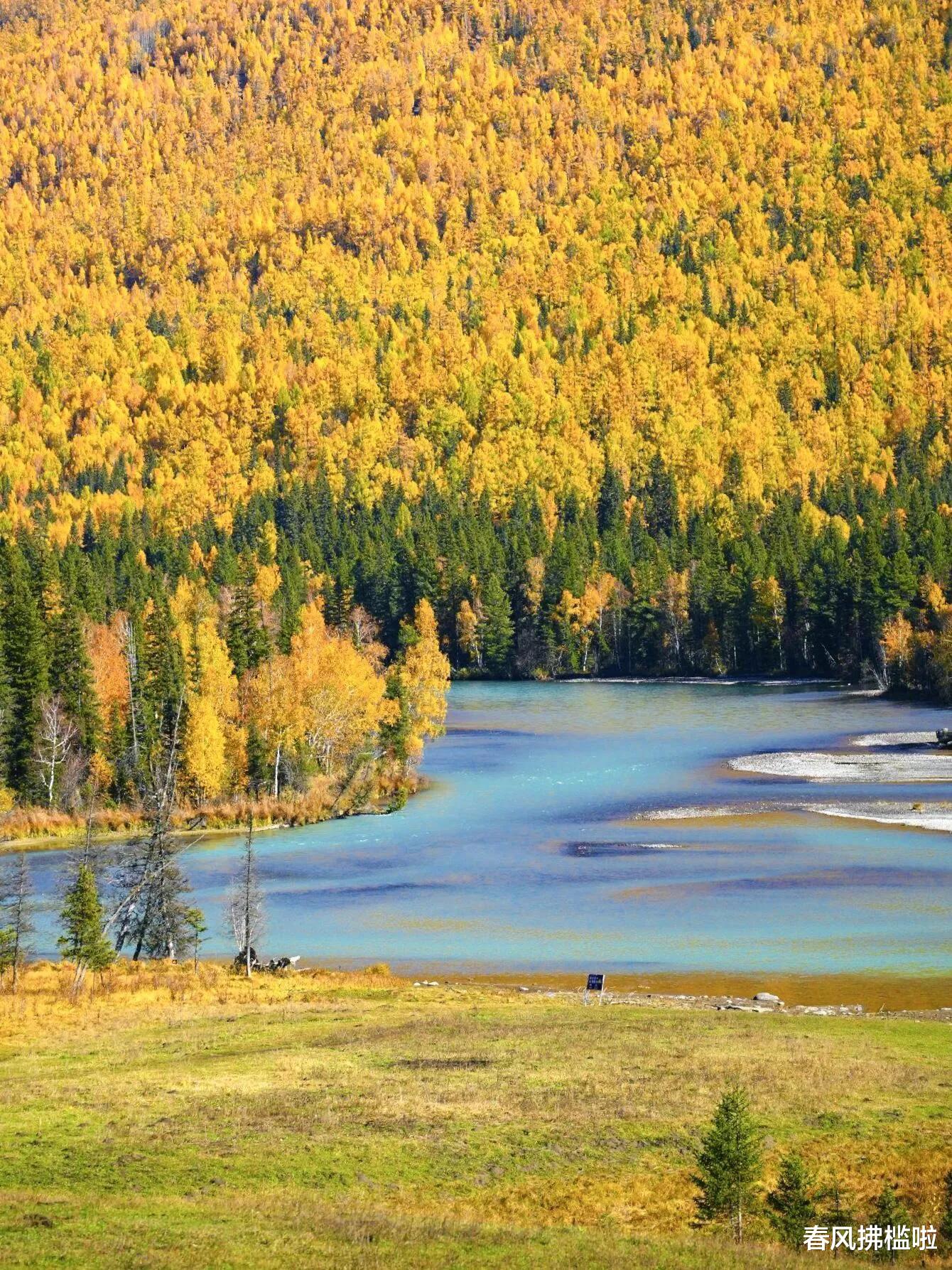 九月中旬至十月初,喀纳斯进入全年最美时期。寒温带泰加林分布广泛,落叶松金黄,云杉苍绿,枫树赤红,白桦亮黄,各种色彩交织成无比绚丽的画卷。