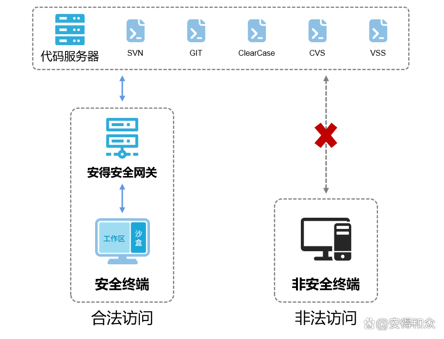 代码服务器是源码核心存储地,当前有账号人员可在不同终端随意访问下载,隐患极大。安得卫士部署安全网关,仅安装安全客户端且获访问策略的终端可接入,阻断非法访问,同时保持原有访问下载效率,互联网环境下也能防外部攻击,支持多种主流代码管理工具。
