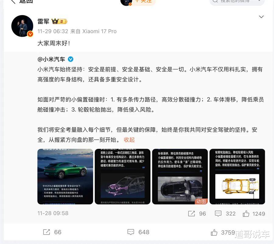 【文/财圈社&道哥说车 听风吟】“你发的到底算不算啊”,在小米汽车创始人雷军有关小米YU7碰撞测试解释视频的评论区中,不少网友进行了类似评论。至于原因,无非就是小米法务团队在针对“碳纤维机盖虚假宣传诉讼”时提到的那句“雷军不懂结构,发的微博不算数”。