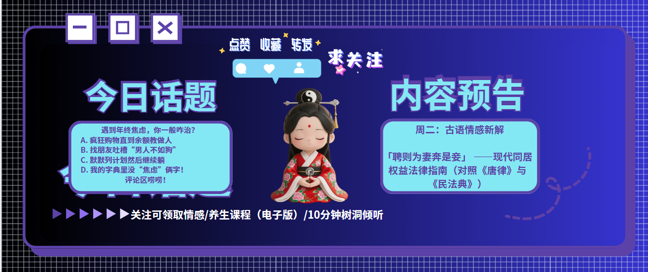 明日预告:明天咱们唠点更劲爆的:「聘则为妻奔是妾」——现代同居权益指南(对照《唐律》和《民法典》),教你用法律守住底线!