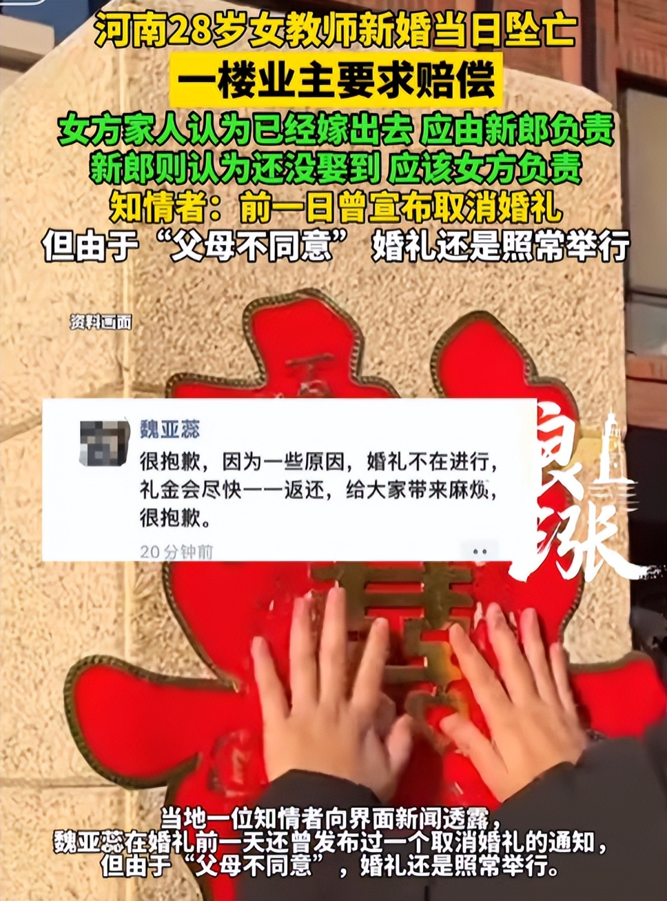 可真相是,她当天根本没去学校,而是在朋友圈发了一条明确的通知:“因为一些原因,婚礼不再进行,礼金会尽快一一返还。” 这条本该终止悲剧的消息,最终石沉大海。婚礼前一天魏亚蕊曾发圈取消婚礼,却被亲属的 “面子工程” 强行压制。