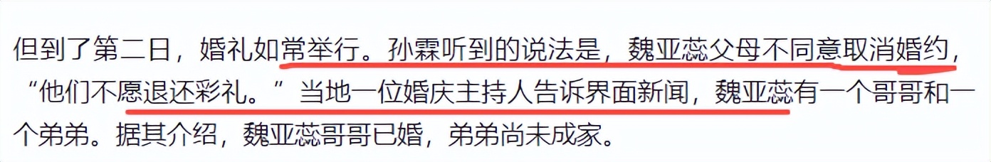 时间线拉回婚礼前一天,更惊人的细节被扒出:魏家摆了二三十桌酒席,作为主角的新娘和新郎却双双缺席,亲属对外统一口径 “魏亚蕊在高中教书赶不回来”。