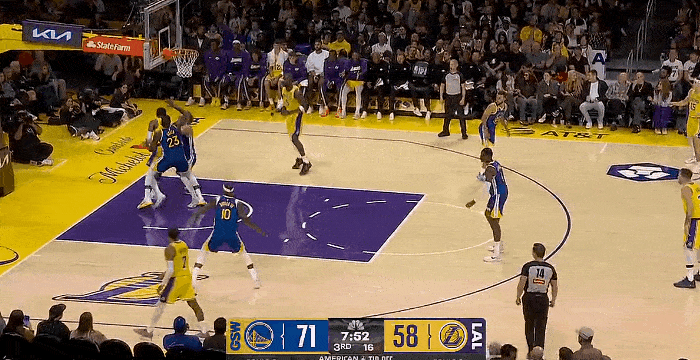 NBA常规赛揭幕战,湖人对阵勇士的比赛正在进行中。